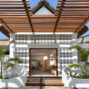 The interiors are evocative of a luxurious beach shack, and each room has its own balcony. Rooms are located on the first and second floors.